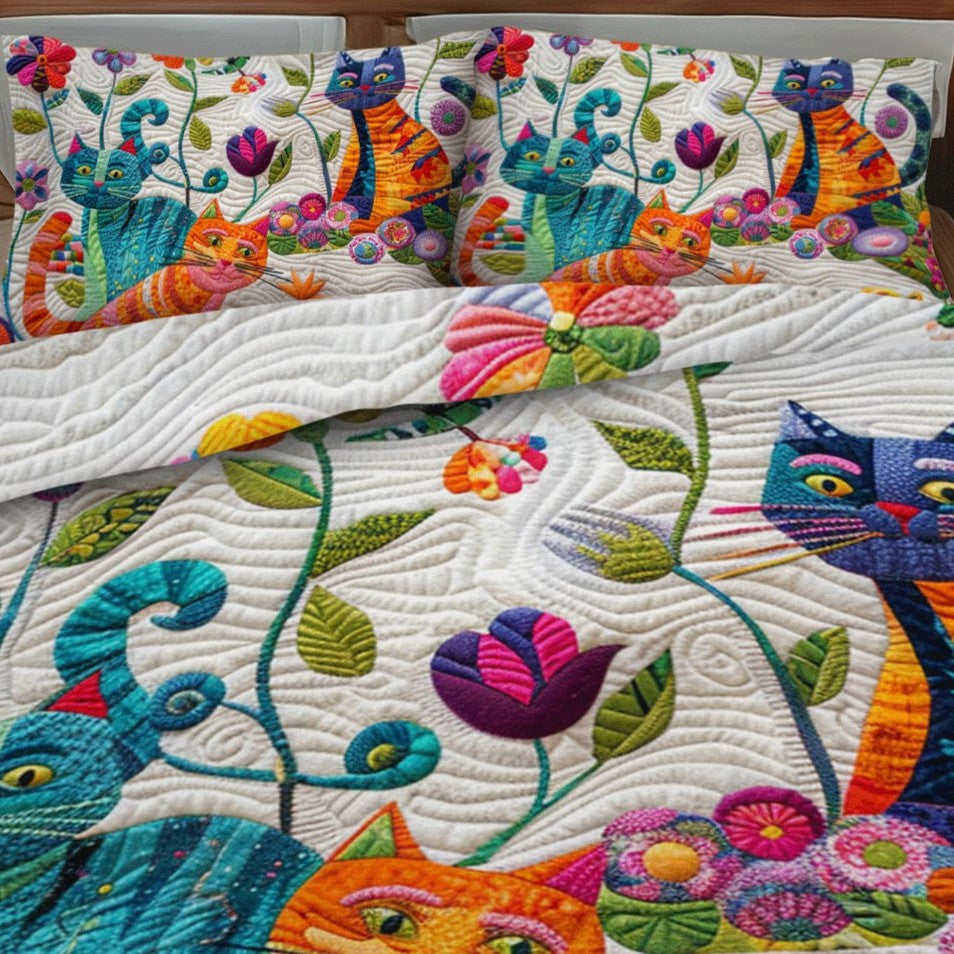 Floral Colorful Cats Artisan Quilt Artwork